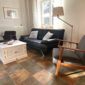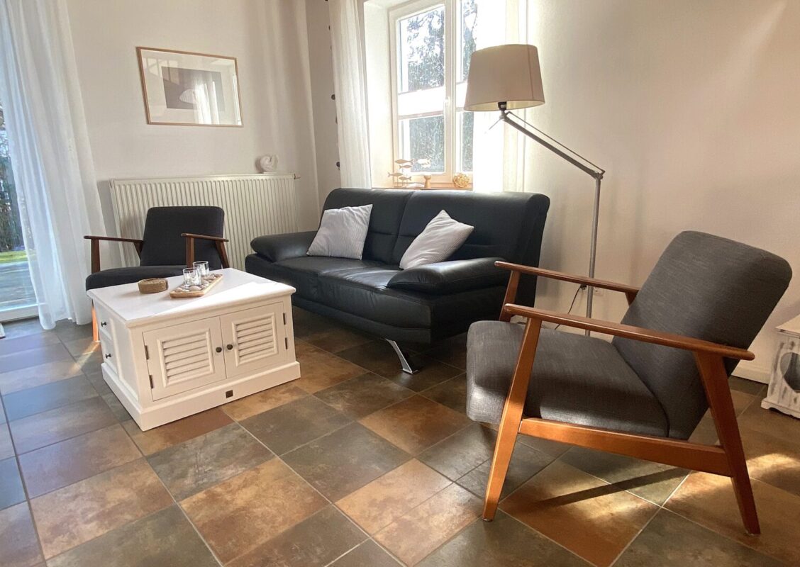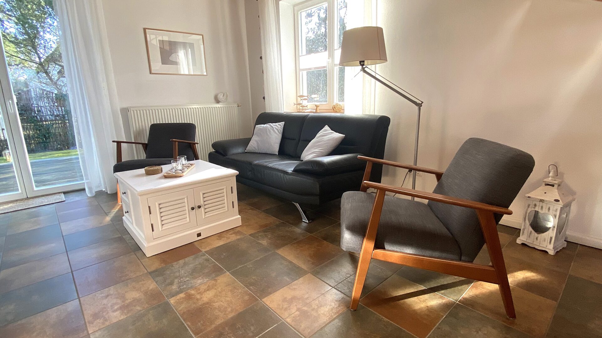 • Gemütlicher, offener Wohnbereich mit bequemem Sofa, zwei Sesseln