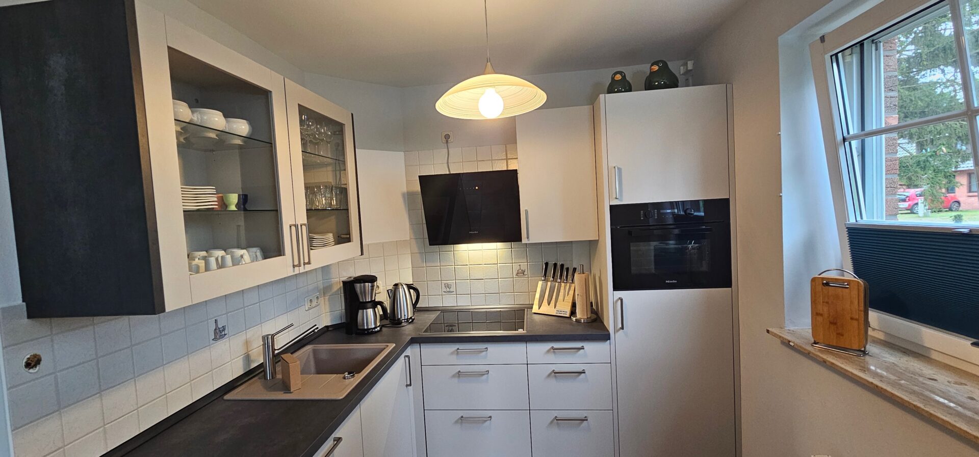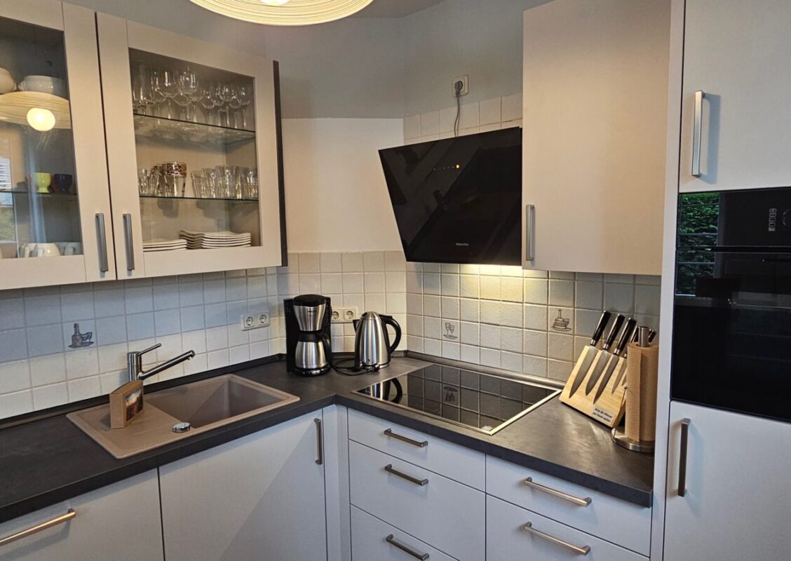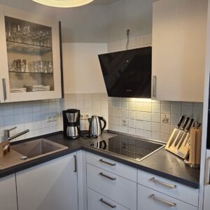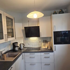 • Einbauküche mit Herd/Ceranfeld und Backofen, Spülmaschine, Kühlschrank mit TK-Fach, Mikrowelle